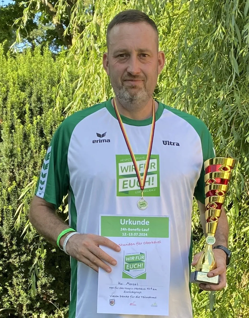 Eine große Ehre für unseren Kai und nun wollen wir ihn bei der Abstimmung auch tatkräftig unterstützen. Nominiert für den Sportler des Jahres 2025 in Oberhavel. Seit vielen Jahren ist Kai Menzel auf den insbesondere „langen Kanten“ unterwegs. Ob Halbmarathon, Marathon oder Supermarathon auf dem Rennsteig, alle ist Kai schon mehrfach gelaufen. Seit vielen Jahren ist er aber auch im Ultra-Walking unterwegs und hat hier auch eine eigene Trainingsgruppe beim SSV Hohen Neuendorf e.V. gegründet. So absolvierte er in diesem Jahr u.a. seine 10. Distanz über die 100km und das in Bestzeit mit knapp über 16 Stunden. Seit 2018 ist Kai auch bei der International Walking Association (IML) unterwegs und konnte im letzten Jahr den Titel „European Walker“ erreichen und in diesem Jahr die „ Silver Medal“ der IML, für den 12. erfolgreich abgelegten internationalen Walk. Darunter lassen sich international anerkannte Veranstaltungen wie den renommierten 4-Tage-Marsch in Nimwegen (4 x 50 / 200km) oder den Dodentocht-Marsch in Belgien (100km) finden. In diesem Jahr war Kai u.a. auch in der Schweiz und in Österreich am Start, wo er in 2 Tagen zwei Marathondistanzen und in 3 Tagen zwei Marathondistanzen und eine Halbmarathondistanz absolvierte. Vom Mammutmarsch in Potsdam/Berlin (100km) ganz zu schweigen. Ferner engagiert sich Kai als sportlicher Leiter bei den Spendenläufen für das Hospiz und wie soll es auch anders sein, startete er auch hier über die Maximaldistanzen und konnte 2024 in 23 Stunden 131km absolvieren und dabei knapp 500€ an Spenden generieren. In 2025 absolvierte er die Hauptstrecke gleich 2x und legte dabei 48km zurück und konnte dabei über 1.200€ an Spenden generieren. Bitte stimmt für unseren Kai bei der Wahl zum Sportler 2025 in Oberhavel ab: https://maz-online.de/sportlerwahl-ohv